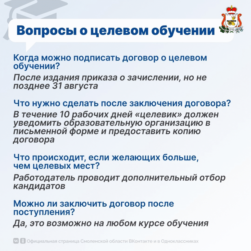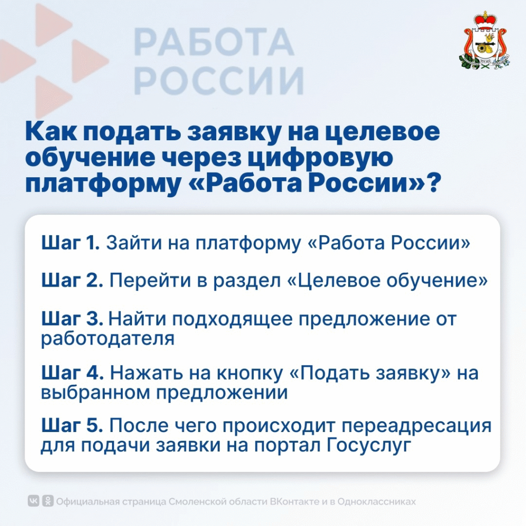 На цифровой платформе «Работа России» (trudvsem.ru/informatio…) представлено более 1500 актуальных предложений о целевом обучении от более чем 100 предприятий и 27 муниципальных образований Смоленской области.