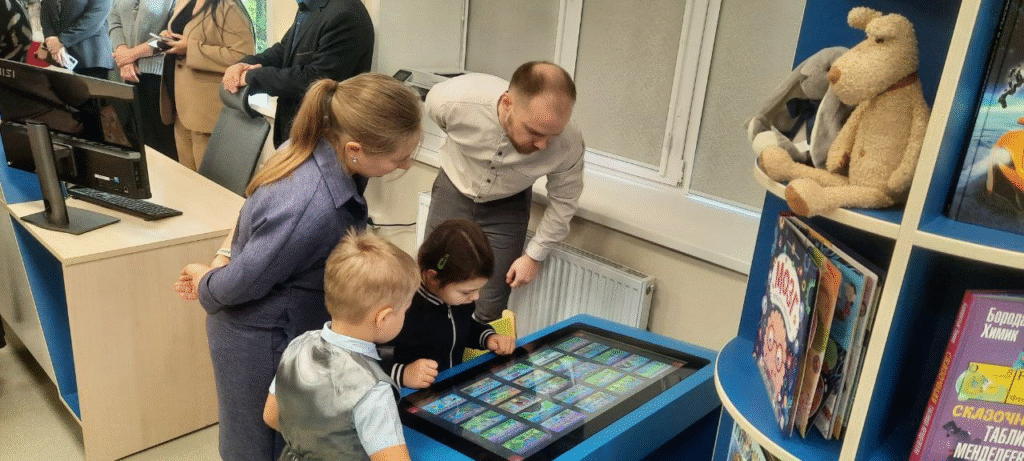 Для учреждения закуплена современная компьютерная техника, планшеты, цифровое пианино, световая песочница, флипчаты, проектор с экраном, телевизоры, аудиосистемы, детский интерактивный стол, шлем и очки виртуальной реальности, интерактивная панель, выставочные стеллажи, в том числе мобильные, с книжными новинками.