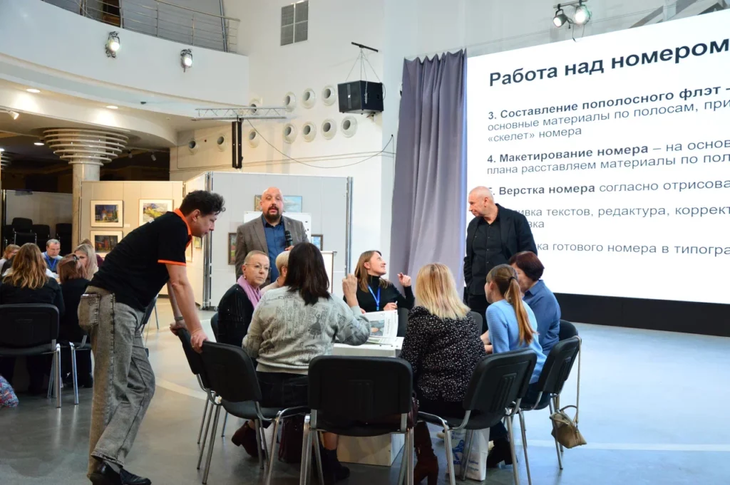 Владимир Касютин провел мастер-класс «Анализ и оценка состояния печатных изданий». Были рассмотрены газеты участников с акцентом на содержание, визуальное оформление и работу с аудиторией. Каждой редакции были даны индивидуальные рекомендации по повышению качества текстов, визуальной подаче и структуре издания.