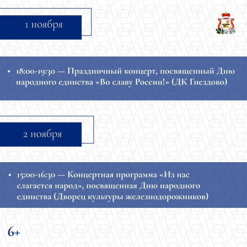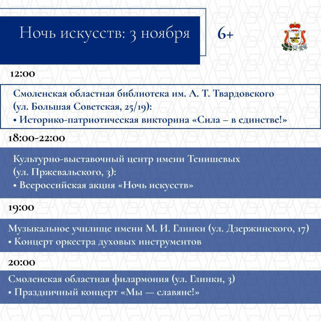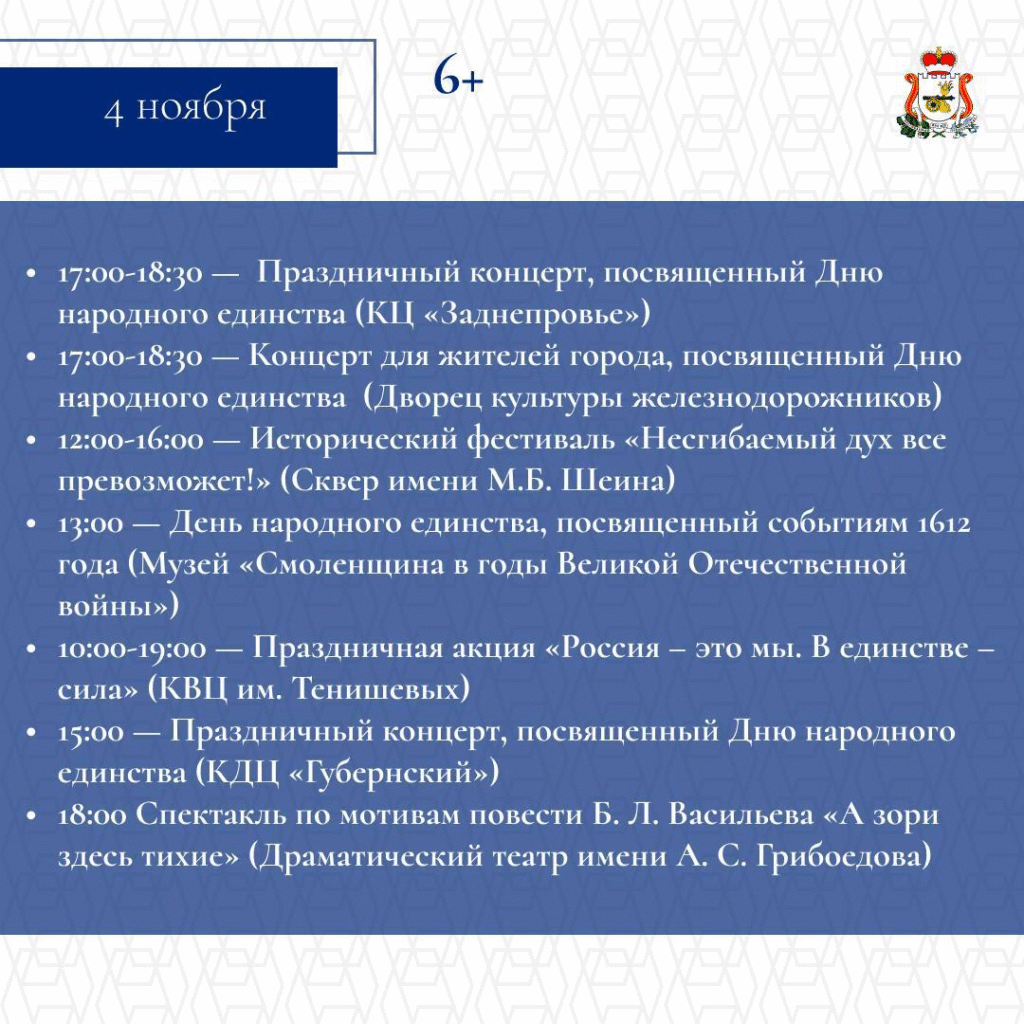 С 1 по 5 ноября в Смоленске состоятся торжественные и культурные мероприятия. Они объединят сотни жителей и гостей региона. Запланированы тематические выставки и экскурсии, патриотические концертные программы и творческие выступления, интерактивные площадки для детей и молодежи, Всероссийская акция «Ночь искусств».
