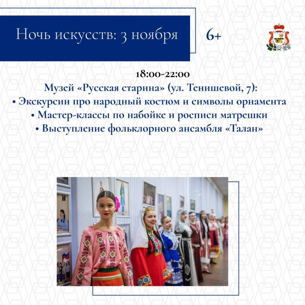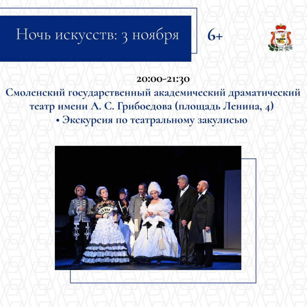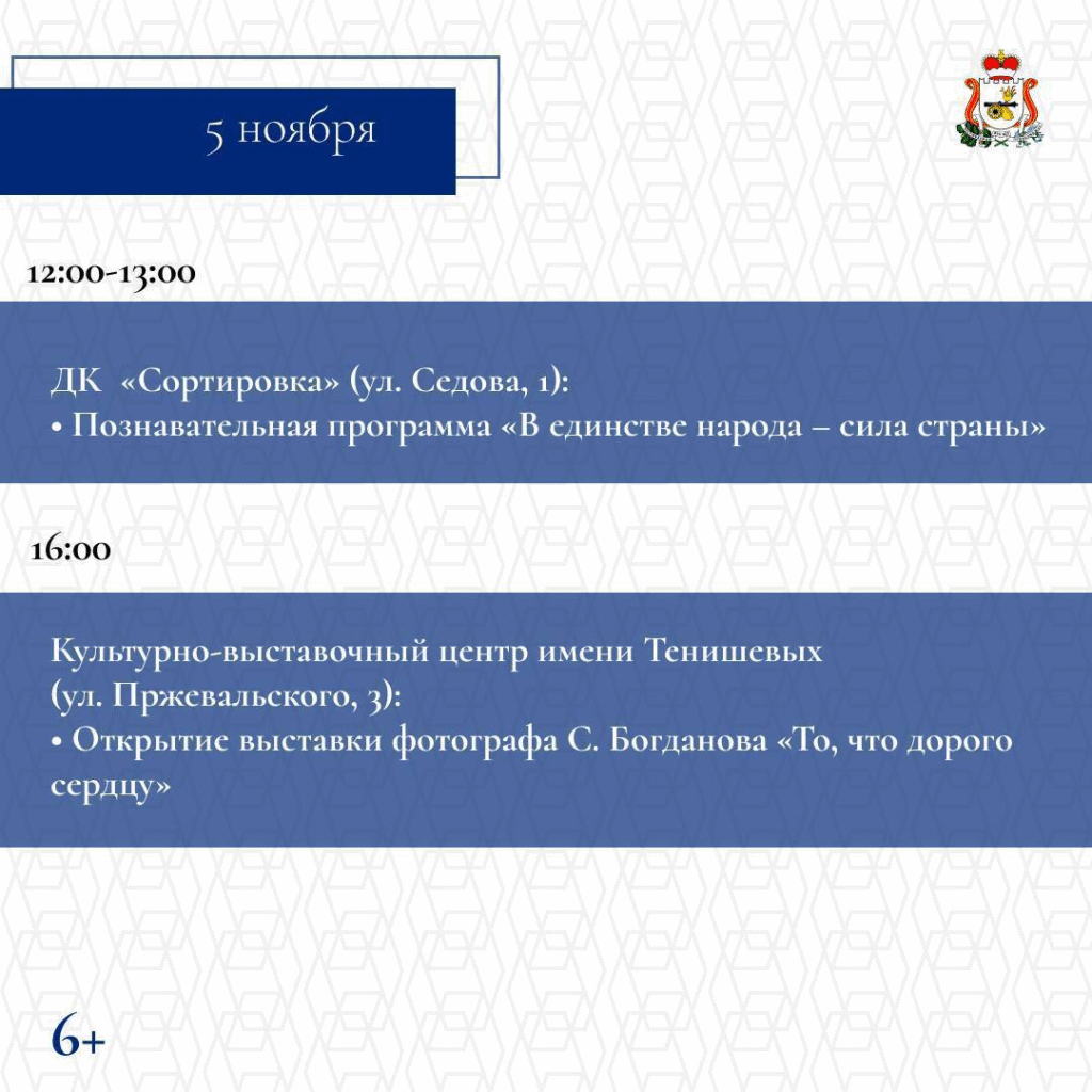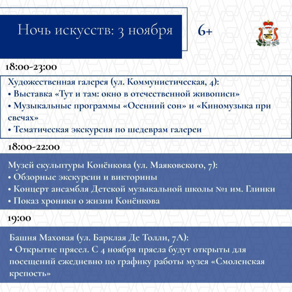 С 1 по 5 ноября в Смоленске состоятся торжественные и культурные мероприятия. Они объединят сотни жителей и гостей региона. Запланированы тематические выставки и экскурсии, патриотические концертные программы и творческие выступления, интерактивные площадки для детей и молодежи, Всероссийская акция «Ночь искусств».