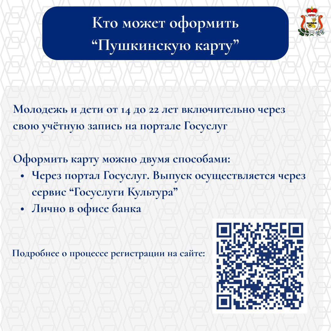 Оформить «Пушкинскую карту» можно на портале «Госуслуги». Более подробная информация размещена на сайте программы: пушка.рф/.