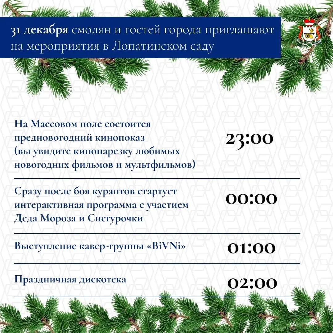 Всего в декабре и январе в области запланировано более 1800 мероприятий. В новогоднюю ночь они пройдут во всех административных центрах муниципальных образований. В Смоленске основные гуляния в ночь с 31 декабря на 1 января развернутся в Лопатинском саду. Глава региона поручил главам взять на контроль организацию праздничных площадок.