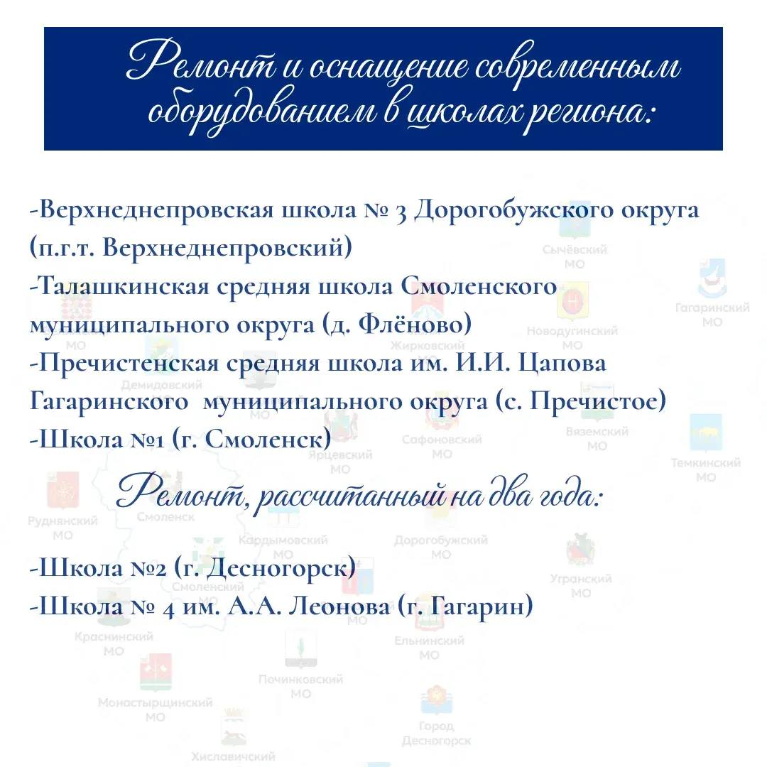 «Капитально отремонтируем и оснастим новым оборудованием шесть школ: Верхнеднепровскую школу № 3 Дорогобужского муниципального округа, Талашкинскую среднюю школу Смоленского муниципального округа, Пречистенскую среднюю школу имени И. И. Цапова Гагаринского муниципального округа, школу № 1 города Смоленска. В школе № 2 города Десногорска и школе № 4 имени А. А. Леонова города Гагарина начнется капитальный ремонт, рассчитанный на два года», — отметил глава региона.