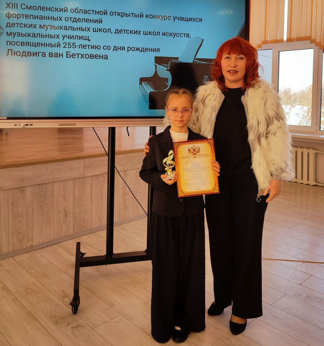 Но это еще не все достижения наших девчонок в новом году. К примеру, Раиса Пусенкова блестяще выступила и стала Лауреатом I степени на XIII Смоленском областном открытом конкурсе учащихся фортепианных отделений детских музыкальных школ, детских школ искусств, музыкальных училищ, который был посвящен 255-летию со дня рождения Людвига ван Бетховена. Проходил конкурс 24 января на базе Смоленского областного музыкального училища имени М.И. Глинки.